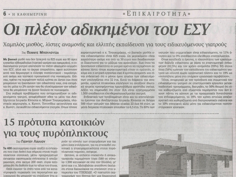 24-06-2008 Χαμηλός μισθός, λίστες αναμονής και ελλιπής εκπαίδευση για τους ειδικευόμενους γιατρούς Της ΠΕΝΝΥΣ ΜΠΟΥΛΟΥΤΖΑ Με βασικό μισθό που δεν ξεπερνά τα 825 ευρώ και 80 ώρες εργασίας εβδομαδιαίως (τακτικό ωράριο και εφημερίες), οι ειδικευόμενοι γιατροί αποτελούν το πλέον αδικημένο κομμάτι του ΕΣΥ, αλλά και το άκρωϊ απαραίτητο, αφού καλύπτουν κενά […]