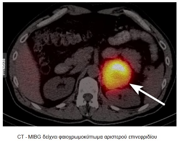 02-12-2007 Ορισμός: Πρόκειται για σπάνιο όγκο της μυελώδους μοίρας των επινεφριδίων. Όταν εντοπίζεται εκτός των επινεφριδίων ονομάζεται παραγαγγλίωμα. Λόγω της αυξημένης έκκρισης κατεχολαμινών (αδρεναλίνης και νορ-αδρεναλίνης, σπάνια και ντοπαμίνης) προκαλεί υπέρταση και καρδιακές αρρυθμίες. Συχνότητα: 0.05-0.2% σε υπερτασικούς ασθενείς και συχνότερα στη λευκή φυλή. Συχνά ανευρίσκεται σε κάποια οικογενή σύνδρομα όπως το […]